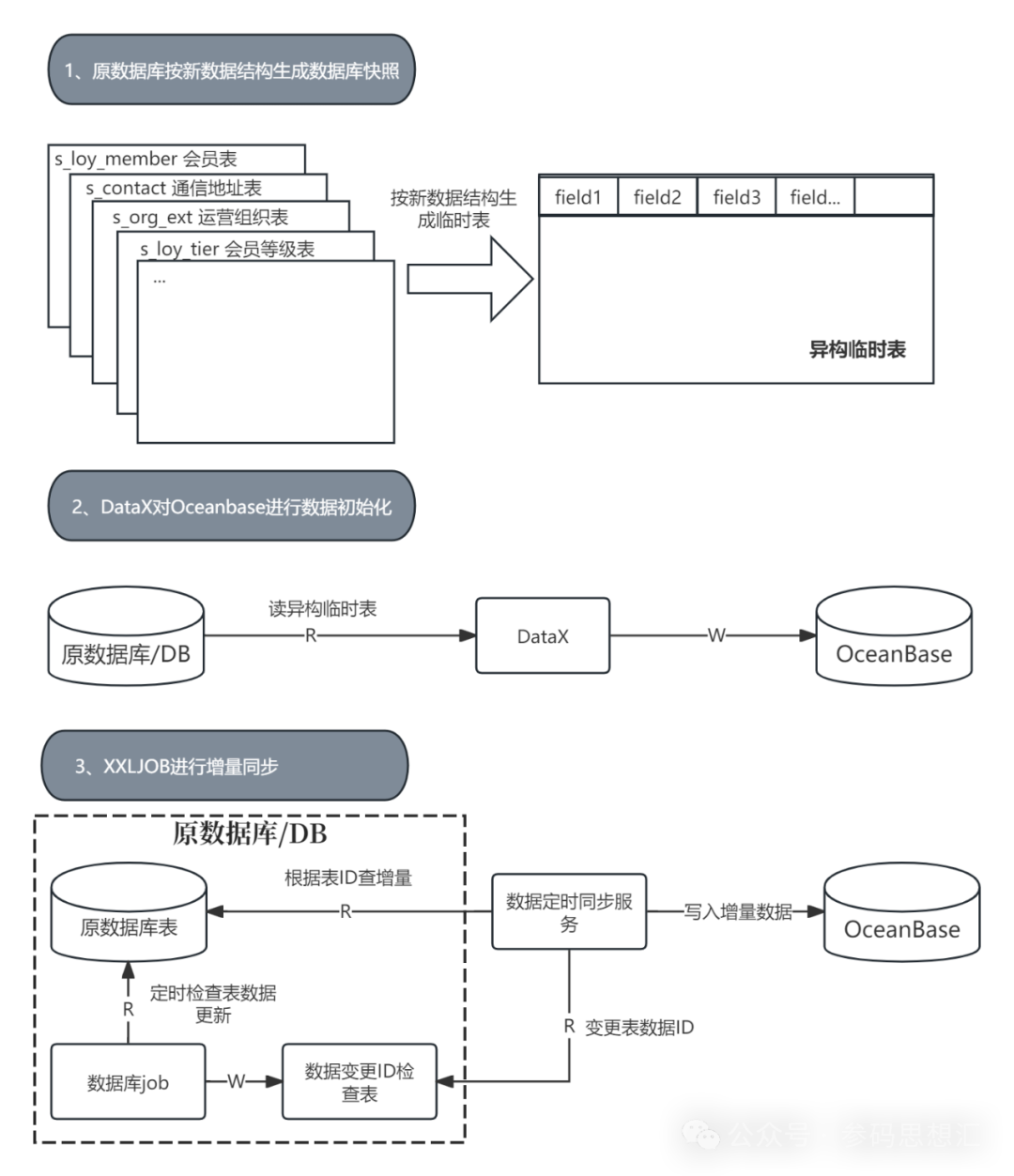 XXLJOB 进行增量同步:第一步中是在原旧数据库生成临时,不停机同步,同步期间肯定也有新的业务数据源源不断的写入旧库,所以用定时同步服务对会员最后修改时间进行扫描比对,最后进行同步覆盖。