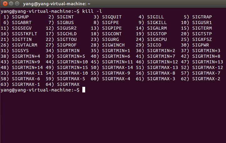 Linux信号的编号是从1-64,其中32和33空缺,没有对应的信号。通过kill -l 可查看所有的信号。
