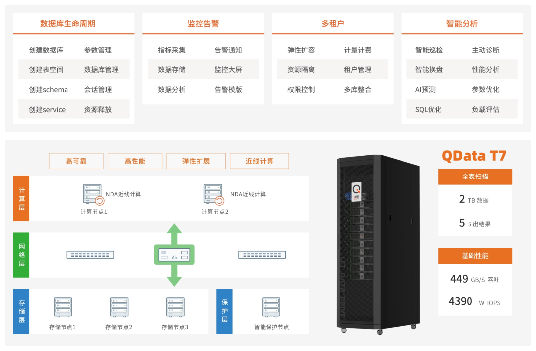 以QData新一代产品T7为例,基于沃趣科技自主研发的QLink及NDA近线数据加速技术,搭配新一代NVMe闪存介质,IOPS 高达 4000W+,TPM 达到了1589万次,可以为企业数据库系统提供高速IO能力。QData T7所具备的高带宽、低延迟等特性可数倍提升OLAP、OLTP场景下的数据吞吐量,通过QBO透明压缩技术、Infiniband网络等软硬件深度结合,为客户业务运行提供坚实支撑。