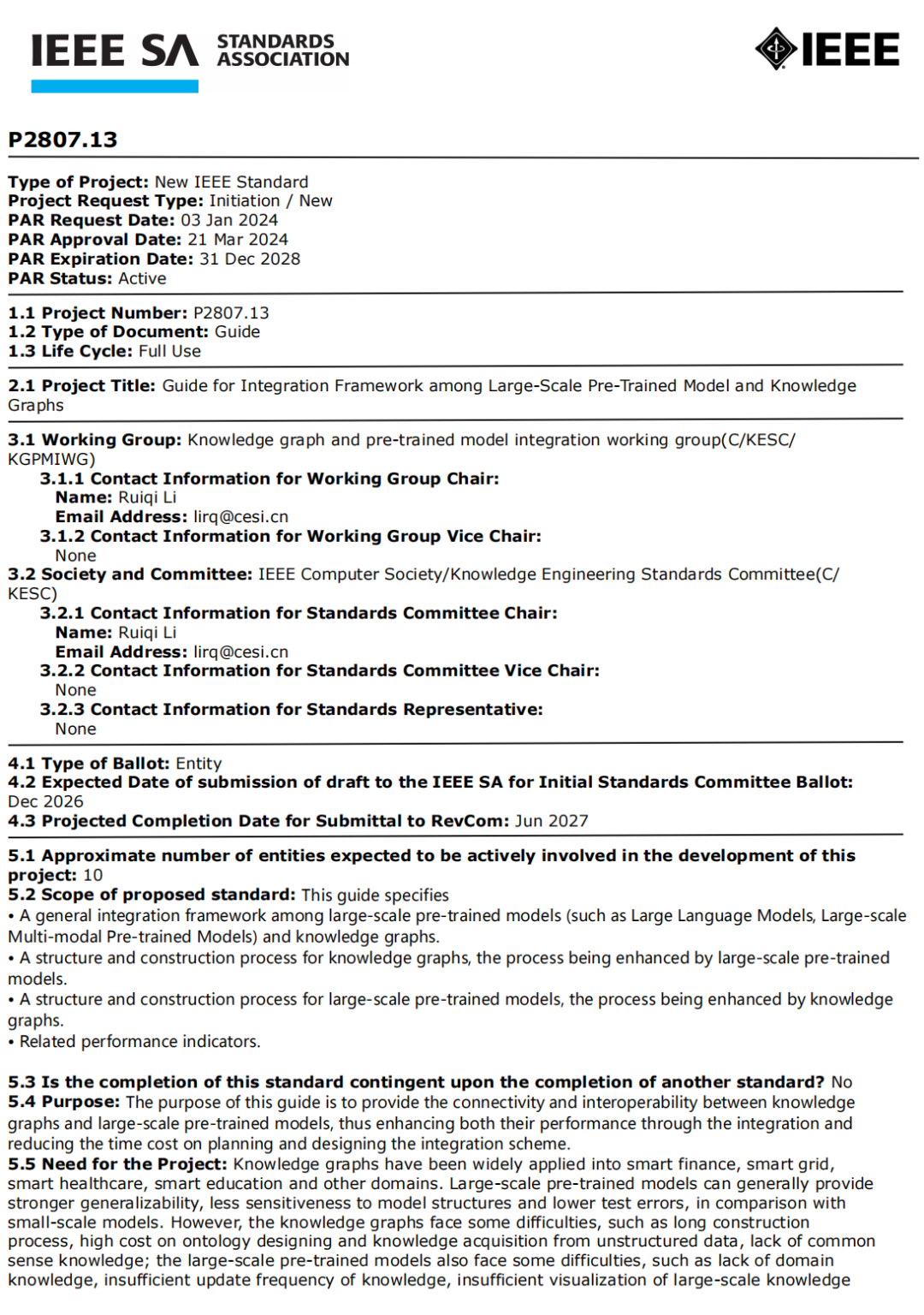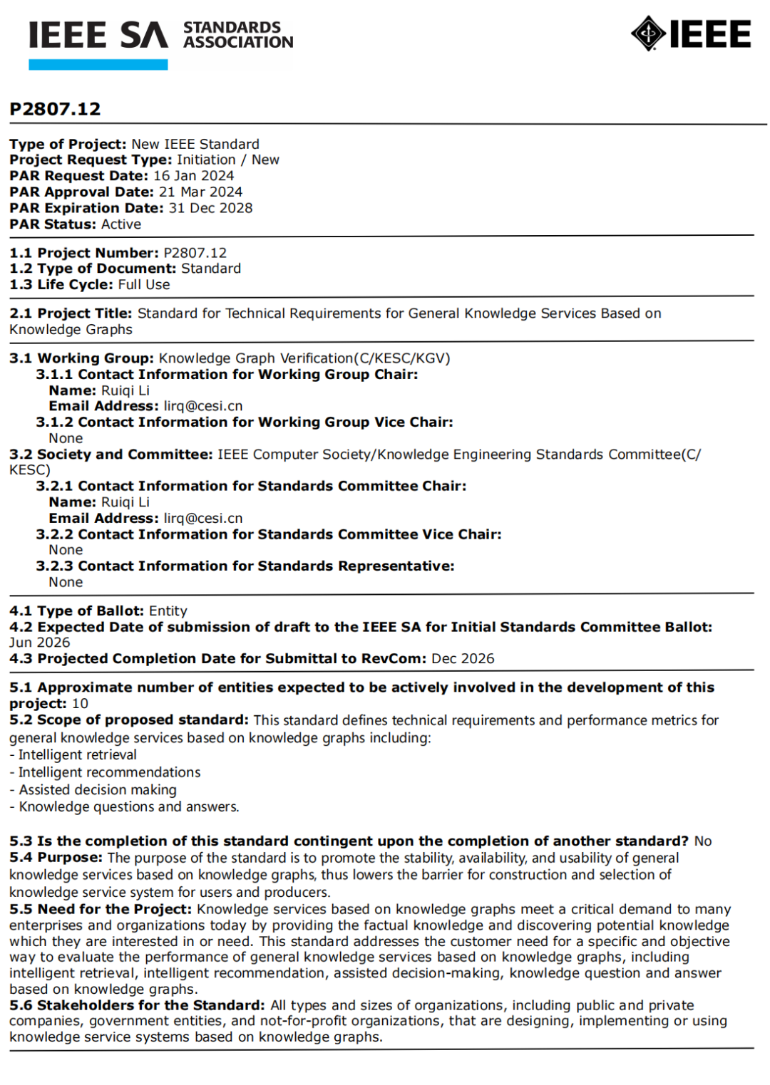 IEEE于2023年6月25日正式宣布成立IEEE知识工程标准委员会,负责指导、管理和监督IEEE知识工程标准的立项、研制、评审、发布、宣贯及相关应用实践过程。IEEE/C/KESC将联合全球产业力量,夯实协作基础,不断推动知识表示、知识建模、知识获取、知识存储、知识计算、知识管理、知识维护、知识应用等知识全生命周期相关标准的研制,提高我国与国际知识工程标准的联动性,为知识工程产业健康有序发展起到指导、规范、引领和保障作用。