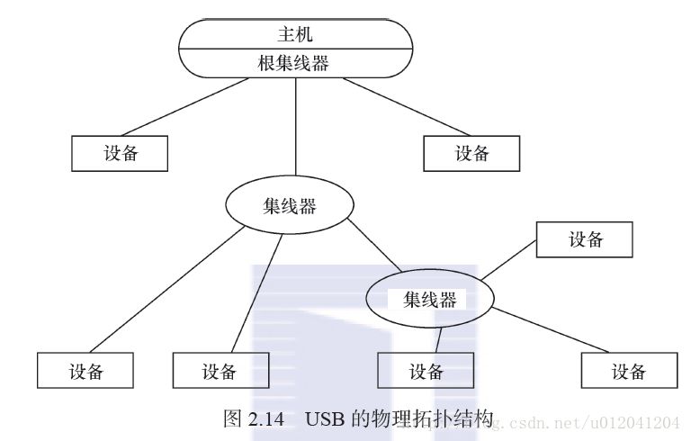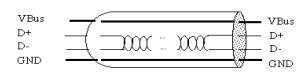 USB2.0总线采用4芯的屏蔽线,一对差分线(D+, D-)传输信号,另一对(VBUS, 电源线) 传输+5v的直流电。
