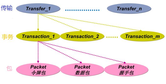 一个传输有多个事务组成,一个事务由2或3个包组成。
