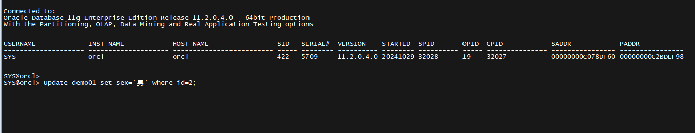SYS@orcl> update demo01 set sex='男' where id=2;