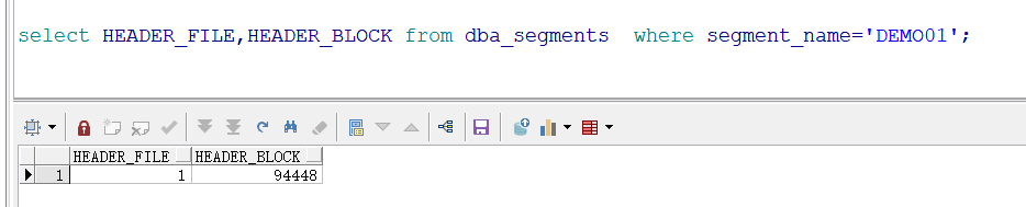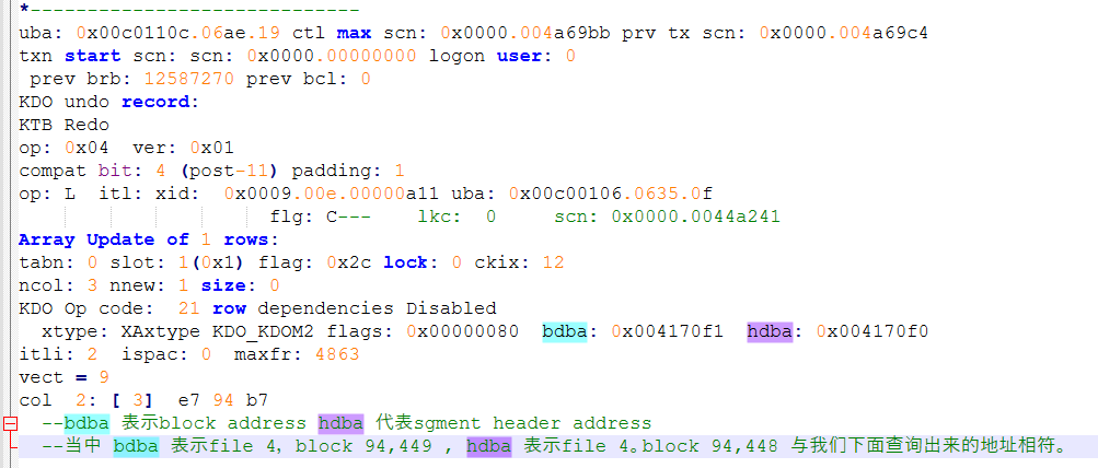 –当中 bdba 表示file 4,block 94,449 , hdba 表示file 4。block 94,448