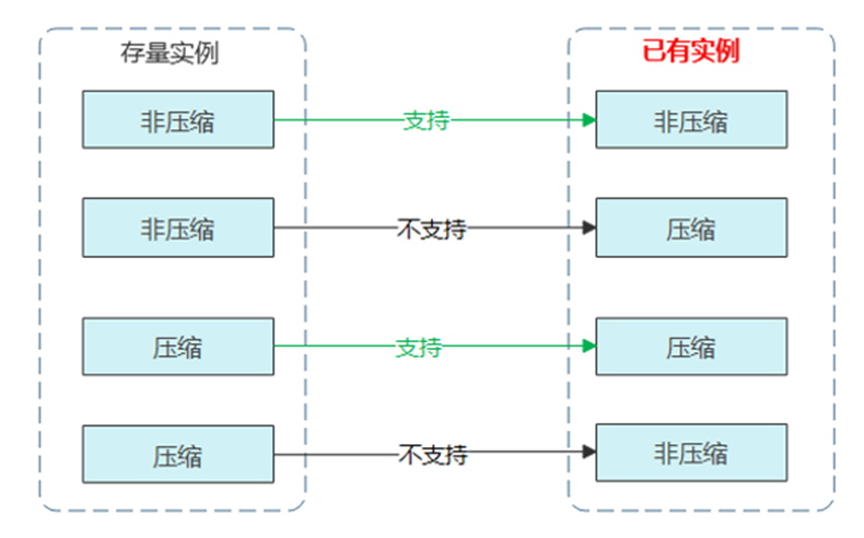 在备份恢复到新实例的场景中,如图2所示,压缩特性支持两种恢复方式:一种是将非压缩存量实例,恢复到非压缩已有实例中;另一种是将压缩存量实例,恢复到压缩已有实例中。
