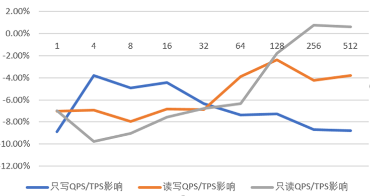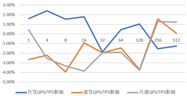 可以观察到,在最坏的情况下,根据TPS/QPS指标来衡量,性能下降不超过5%。