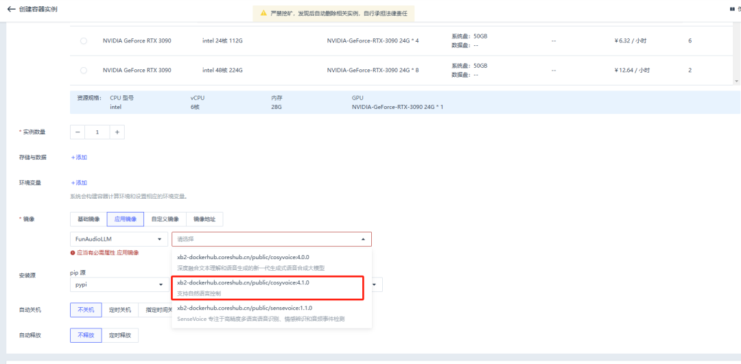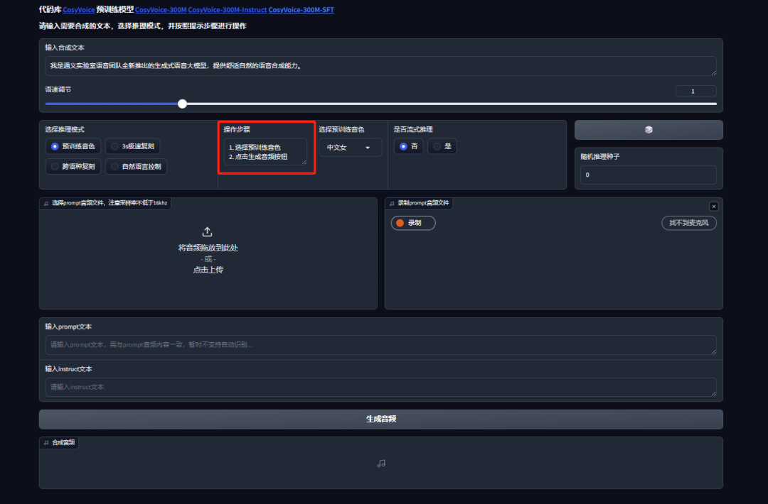 FunAudioLLM 是阿里巴巴通义实验室推出的一款开源语音大模型,它包含两个核心模型:SenseVoice 和 CosyVoice 。SenseVoice 专注于多语言语音识别、情感辨识和声音事件检测,支持超过 50 种语言,尤其在中文和粤语的识别上表现优异,准确率提升超过 50%。它还能够识别多种情绪和交互事件,如音乐、掌声、笑声、哭声等。CosyVoice 则擅长语音合成,能够根据少量原始音频快速生成模拟音色,包括韵律和情感细节,并支持跨语言合成。FunAudioLLM 的应用场景非常广泛,如语音到语音翻译、情感语音对话、互动播客和有声读物等。例如,在语音到语音翻译场景中,它可以将中文语音翻译成英文语音,同时保留原说话人的音色和情感色彩。在情感语音对话中,它可以与用户进行带有情绪色彩的交互,提升用户体验。此外,它还可以用于制作互动播客和有声读物,提供丰富多彩的听觉体验。● 语音翻译:将输入语音翻译成目标语言,并使用目标语言生成语音。● 情感语音聊天:识别输入语音的情绪和音频事件,并生成与情绪相符的语音。● 交互式播客:根据实时资讯、知识等内容生成播客脚本,并使用 CosyVoice 合成语音。● 有声读物:分析文本中的情感和角色,并使用 CosyVoice 合成具有丰富情感的有声读物。2. 选择资源与镜像 FunAudio 下的 CosyVoice 模型(推荐选择 1 卡 3090 )。3. 创建好容器实例后,选择更多访问,点击端口 9001,进入 WebUI 界面。4. 根据页面操作提示可以使用不同的功能生成音频。● 预训练音色:使用模型本身预训练音色,按照输入文本生成音频;【基石智算是青云科技旗下的 AI 算力云服务平台,为用户提供一站式模型开发训练一体化服务】● 3s 极速复刻:上传自己的音频文件或在线录制音频,模型会根据你的音频训练出相同音色,输入 prompt 文本,就可以使用你的音色读出文字了;● 跨语种复刻:将你上传的普通话音频,转变成粤语、日语、英语等;● 自然语言控制:可在语音中添加自然的笑声,喘气、生气等语气。注意:使用自然语言控制功能时,需要更换模型,重新创建实例,选择 FunAudioLLM 中的 CosyVoice-300-instruct 使用。同样创建容器实例,选择资源,但在选择应用镜像时,选择 FunAudioLLM 中的 SenseVoice 模型。以同样方式进入 WebUI 界面,使用流程与 CosyVoice 相同。