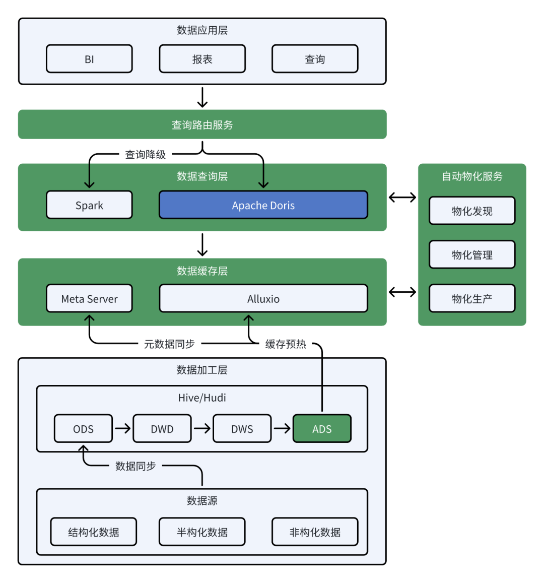 数据缓存层:ADS 层数据缓存到 Alluxio 中,以提供高性能的数据缓存访问能力。同时,元数据也缓存到元数据管理服务中,以提供统一的、稳定的元数据访问服务。 数据查询层:基于 Apache Doris 提供对 ADS 层数据的高性能查询服务。