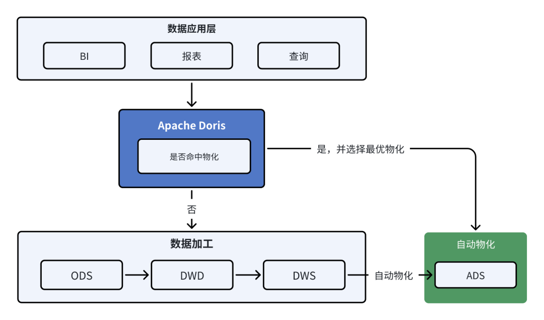消费者访问 DWS 层数据表,并基于 DWS 层进行看板和报表的配置。 ADS 层实现自动物化,提供实际的数据访问,物化视图的生产逻辑对数据工程师屏蔽,全部托管在计算引擎 中。 Doris 根据查询自动选择最优的物化视图,从而实现查询加速。
