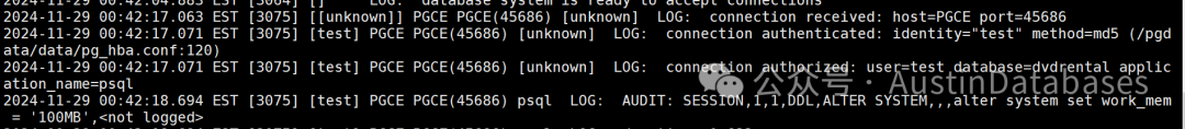 2024-11-29 00:34:17.713 EST [2992] [test] PGCE PGCE(50444) psql LOG: AUDIT: SESSION,2,1,DDL,ALTER SYSTEM,,,alter system set work_mem = '100MB',<not logged>