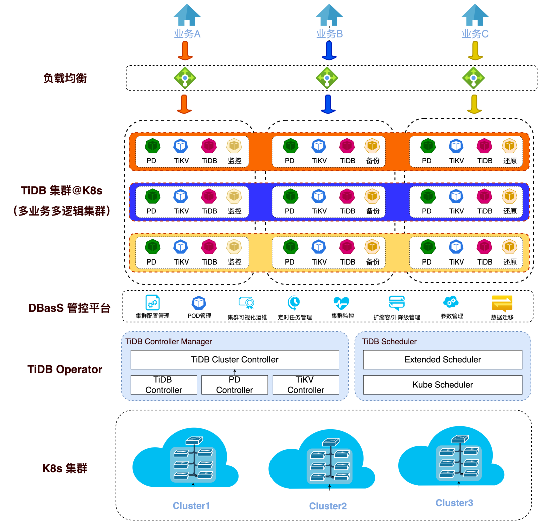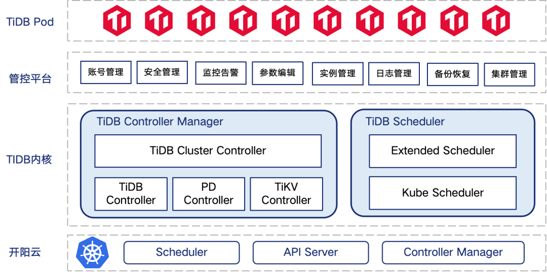 基于 TiDB Operator ,构建 TiDB 集群运维管理功能,提供包括部署、扩缩容、备份恢复、参数变更、监控告警等云 TiDB 产品的全生命周期管理;