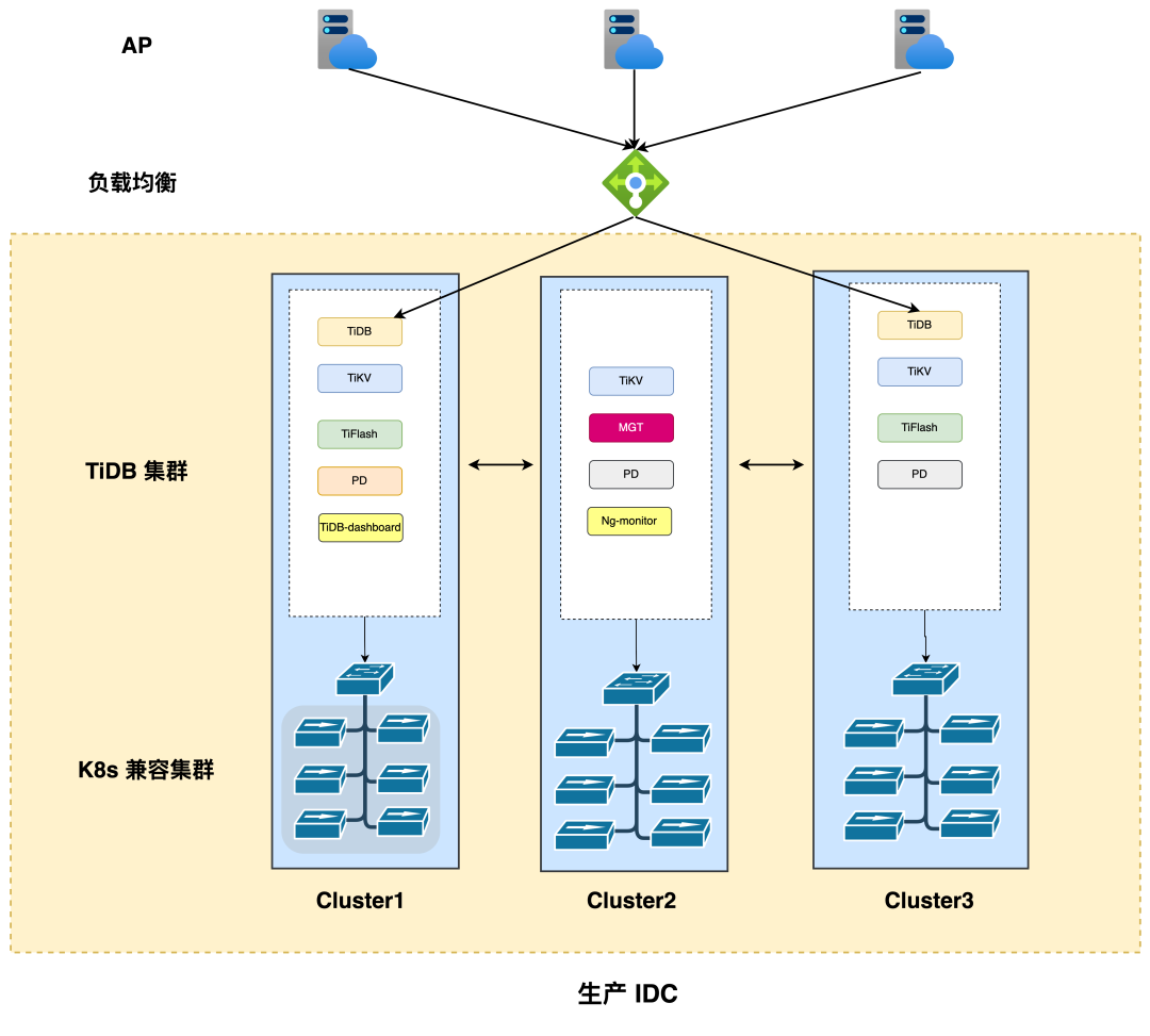 K8s 兼容集群包含 3 个物理集群;均在生产 IDC;