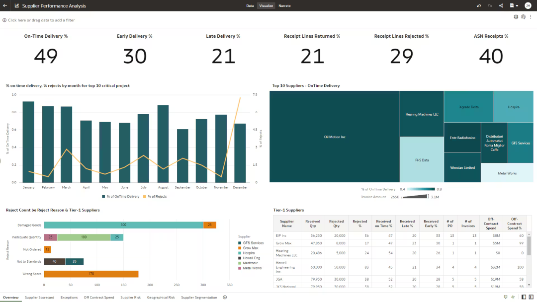 Fusion ERP Analytics 是 Oracle 广泛的分析工具套件的一部分,能支持各种在财务、项目以及采购上的功能用例。它建立在 Oracle 基于云技术的数据和分析平台上,包括可扩展、原生 OCI 的 Oracle Analytics Cloud,能提供可视化自助服务以及完全监管的语义层;以及 Oracle Autonomous Data Warehouse,能作为底层数据平台提供高度优化、完全托管的数据仓库环境,并能利用机器学习(ML)自动执行修补、调整、备份以及更新。以下是一些关键应用场景: