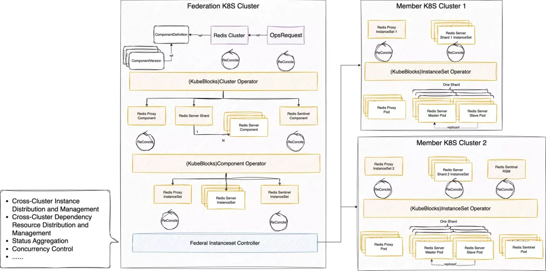 - 分层架构设计:基于不同 Workload 分别管理分片及其下的实例;具体而言,使用一个 StatefulSet 管理每个分片下的多个实例,并在此基础上构建一层新的工作负载,以实现对整个 Redis Server 集群中多个分片的统一管理;