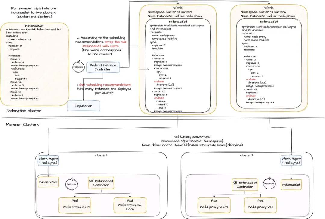 - InstanceSet 拆分与分发:负责拆分 InstanceSet,并将其分发到多个成员集群。