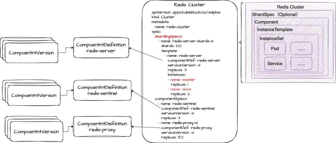 经过与 KubeBlocks 社区深度合作,我们通过如下方式实现一个 Redis 集群的编排: