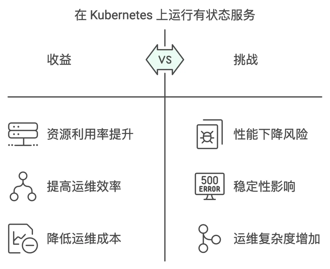 综上所述,有状态服务部署在 Kubernetes 上相比无状态业务来说需要更多风险考量,且实现的成本和难度相对较高。然而,这种投入往往是一次性的,而云原生化带来的收益则是持续性的,可以为企业未来发展提供坚实基础。因此,企业在决策时应充分权衡这些因素,以做出更具战略性的选择。