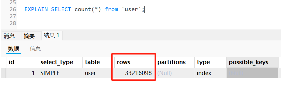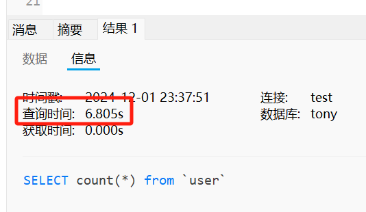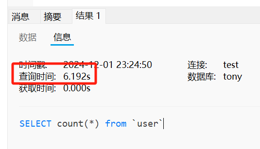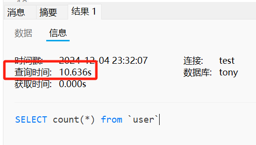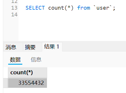如下图所示,一张有 3000多万行记录的 user 表,执行全表 count 操作需要 14.8 秒的时间。