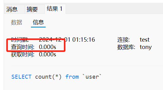 接下来我们稍作调整再试一次,神奇的一幕出现了,执行全表 count 操作竟然连 1 毫秒的时间都用不上。