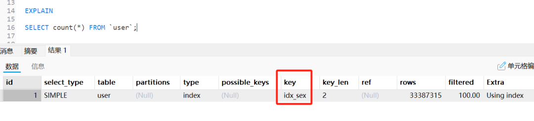 为了验证这个说法,我们给 user 表中最小的 sex 字段加一个二级索引,然后通过 EXPLAIN 命令看一下 SQL 语句的执行计划: