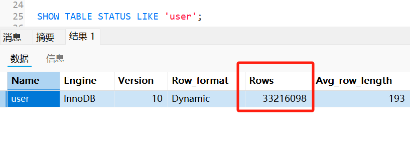 如下图所示,通过 SHOW TABLE STATUS 命令也可以查出来全表的行数: