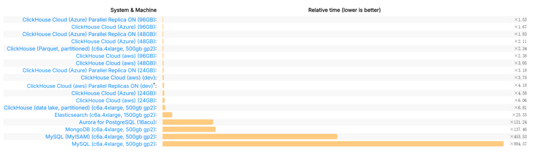在一系列官方公布的基准测试对比中,ClickHouse都遥遥领先对手,这其中不乏一些我们耳熟能详的名字。