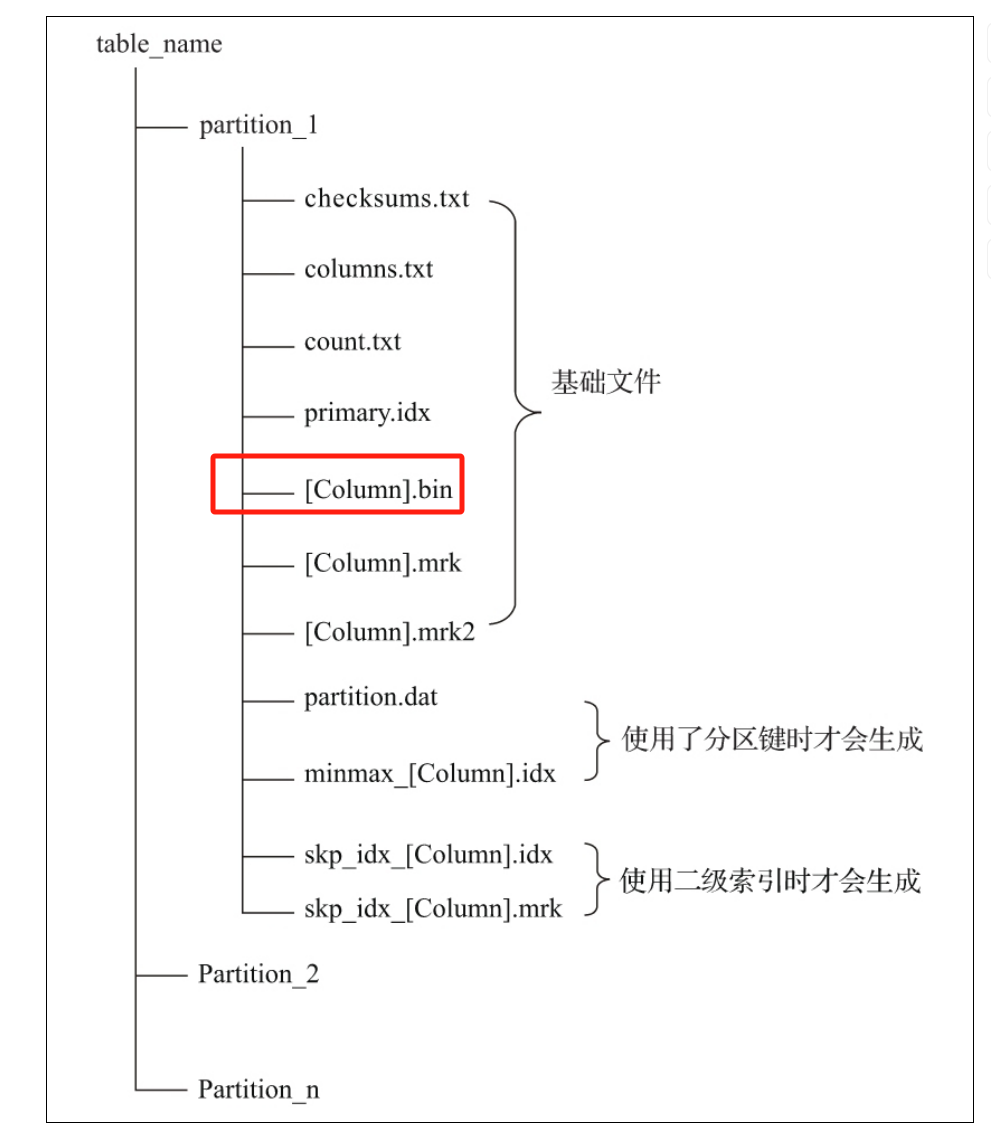 而Clickhouse的存储形式则完全不一样了,它是以数据列的方式进行组织存储的,每个列字段都拥有独立的.bin数据文件,并以列字段的名称命名。