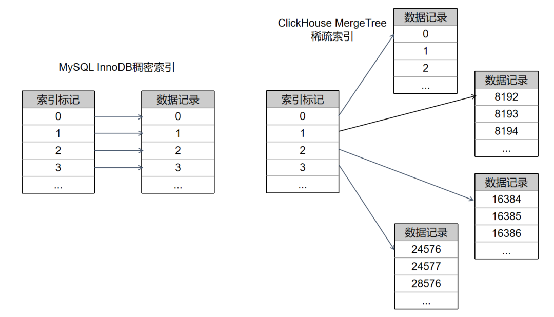 ClickHouse与MySQL InnoDB的索引设计方式截然不同,它的一级索引是采用稀疏索引的方式进行实现的。