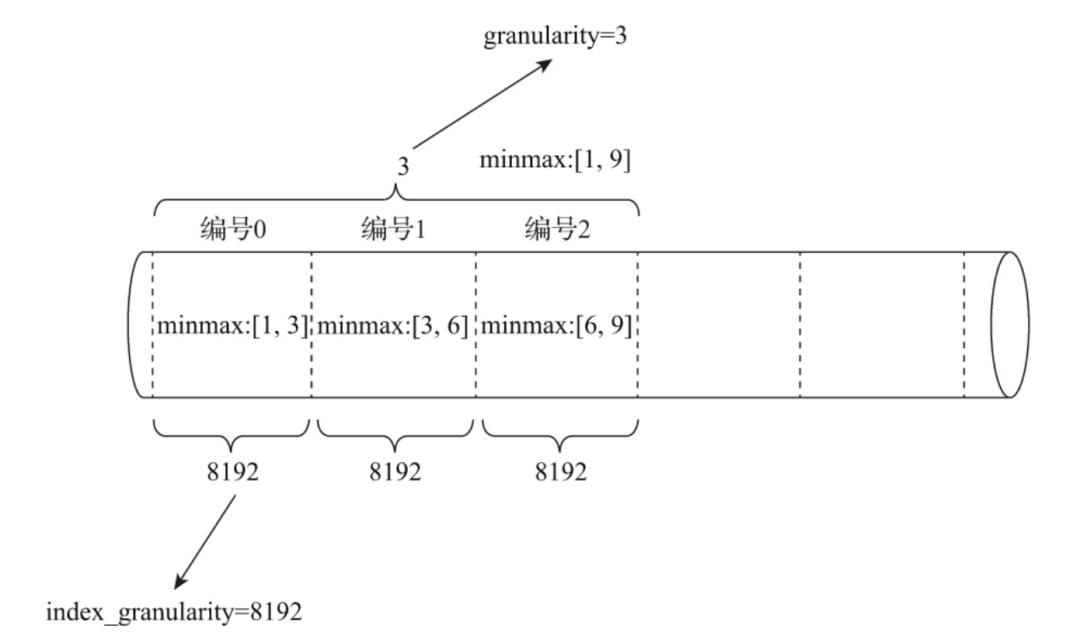 minmax索引,用来记录N(N = granularity)个数据块内的最大值和最小值,在对某列数据进行范围查询的时候,可以过滤掉不满足条件的数据区间,其适用于数据区分度比较高的场景。