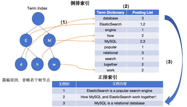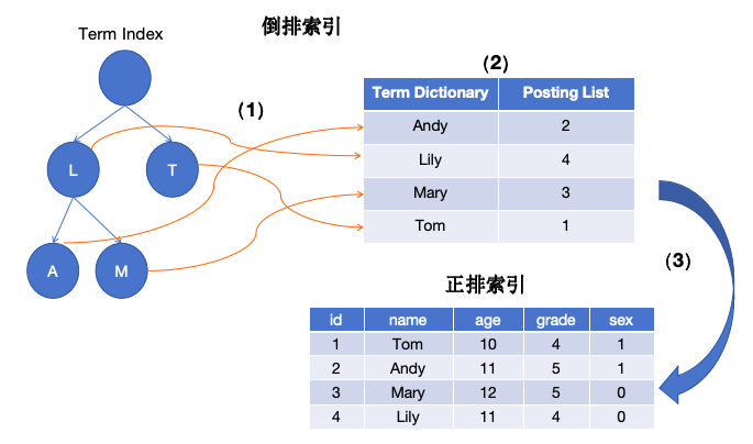 注:Term Index = 单词索引,Term Dictionary = 单词字典,Posting List = 倒排列表。