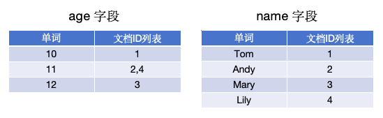 当将该表中的数据保存到ES时,ES会为表中的每个字段都建立一个倒排索引。以name和age字段为例,如下图所示: