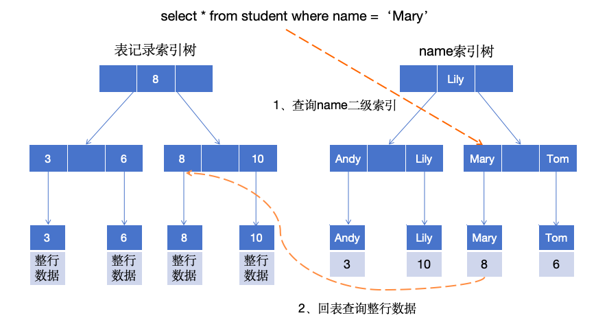 一共分为两步,先通过name的二级索引树查询’Mary‘所对应的记录ID,拿到记录ID后去表记录索引树中查到对应的行记录。