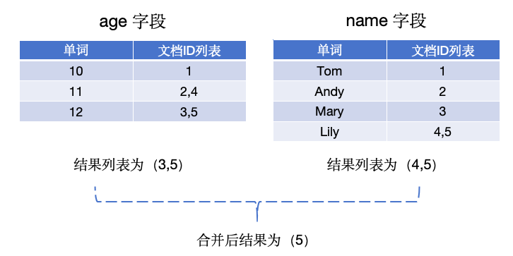 在ES中,支持SkipList和Bitset两种方式进行数据结果合并,前者是采用相互跳跃对比并得出合集的方式,后者则通过倒排列表的值计算出各自的Bitset,并进行AND操作合并。