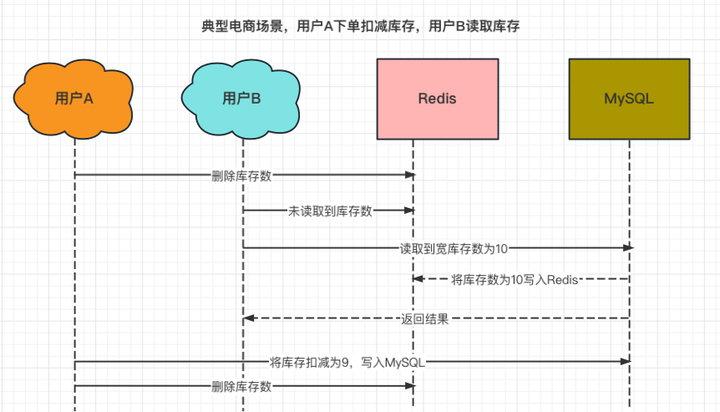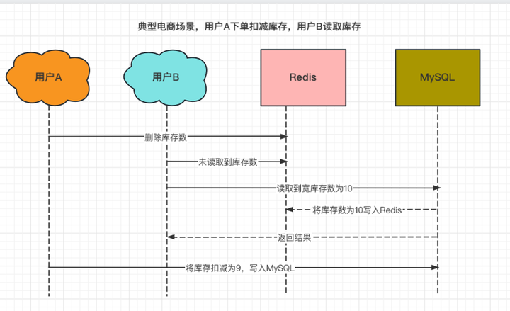 这时,用户B查询该商品的库存,发现Redis中并没有该商品的库存,于是从MySQL中读取库存数后,写入到了Redis中(10个)。