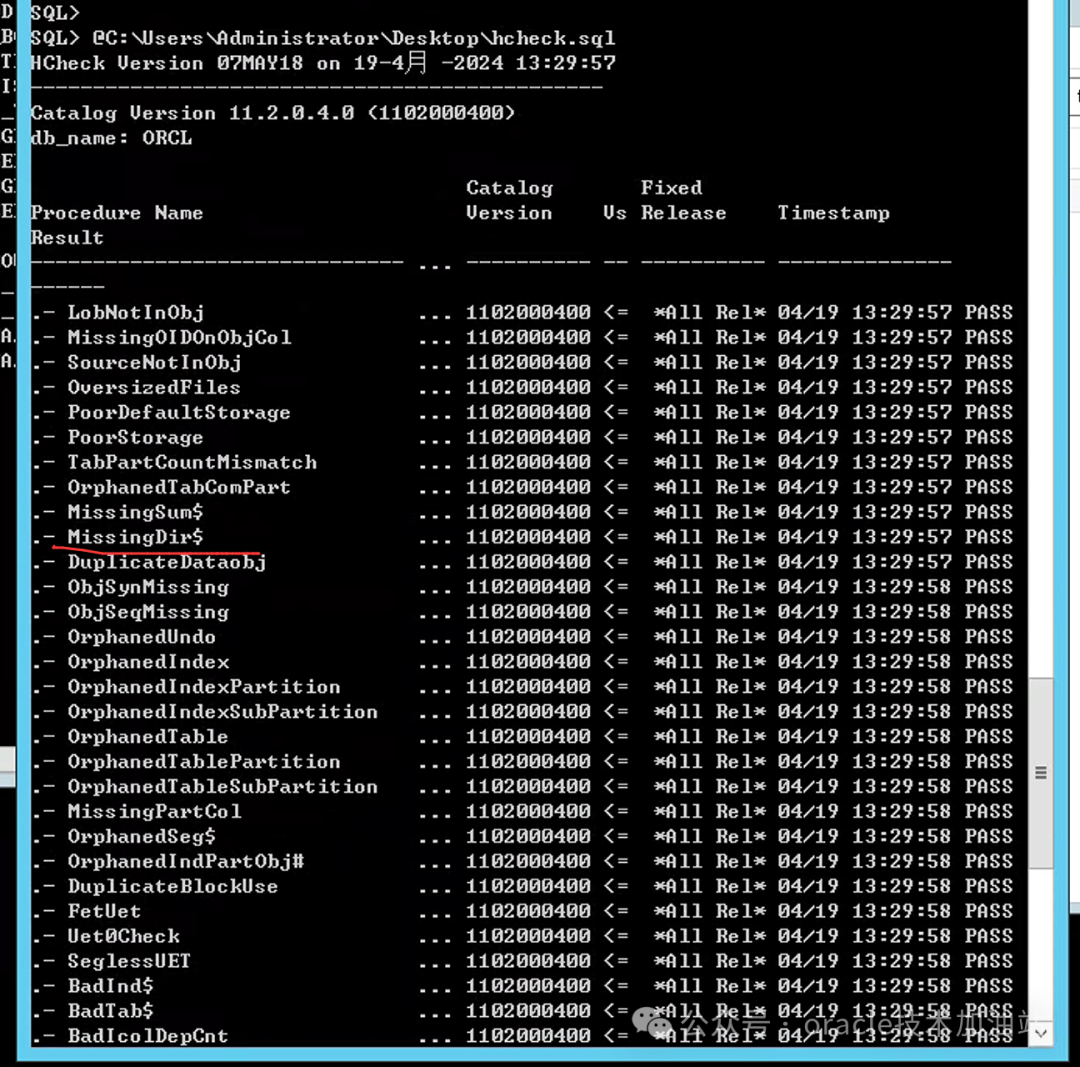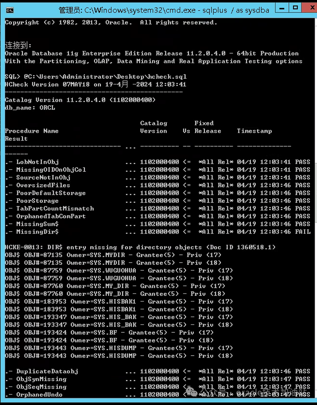 4)我使用hcheck.sql检查数据字典,确实发现了问题,报错如下: