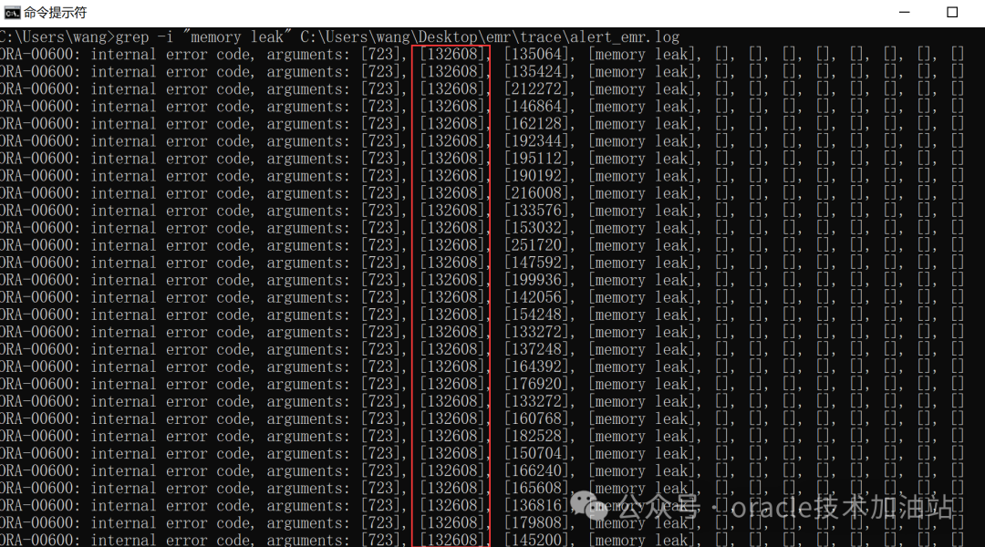 ,发现723为pga中内存泄漏问题,参数a代表代表会话注销时候pga使用大小,b代表内存超出泄漏时候会话断开大小;于是进一步把日志拷贝到本地分析,第一个a值始终为132608字节:
