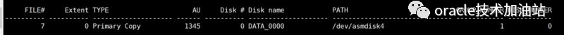 3、kfed 解析ADVMset line 200col diskgroup_name for a15col disk_name for a10col path for a40select a.group_number,a.name diskgroup_name,a.type,a.allocation_unit_size/1024/1024 unit_mb,a.voting_files,b.name disk_name,b.path,b.os_mb/1024 as os_gb,b.total_mb/1024 as total_gb,b.free_mb/1024 as free_gb3 from v$asm_diskgroup a,v$asm_disk b where a.group_number=b.group_number;GROUP_NUMBER DISKGROUP_NAME TYPE UNIT_MB VO DISK_NAME PATH OS_GB TOTAL_GB FREE_GB------------ --------------- -------------------- ---------- -- ---------- ---------------------------------------- ---------- ---------- ----------1 DATA EXTERN 1 N DATA_0000 /dev/asmdisk4 29.296875 29.296875 25.98144531 DATA EXTERN 1 N DATA_0001 /dev/asmdisk5 29.296875 29.296875 25.9843752 FRA EXTERN 1 N FRA_0000 /dev/asmdisk6 9.765625 9.765625 8.41015625--先读取文件目录,是在10号au上[grid@hisdb01 ~]$ kfed read /dev/asmdisk4 aun=0 blkn=0|egrep -i "aus|f1b1locn"kfdhdb.ausize: 1048576 ; 0x0bc: 0x00100000kfdhdb.f1b1locn: 2 ; 0x0d4: 0x00000002[grid@hisdb01 ~]$ kfed read /dev/asmdisk4 aun=2 blkn=7 aus=1M|egrep "block|disk|au"|egrep -v "65535|4294967295"kfbh.block.blk: 7 ; 0x004: blk=7kfbh.block.obj: 1 ; 0x008: file=1kfffde[0].xptr.au: 1345 ; 0x4a0: 0x00000541 --分配信息在0号磁盘的1345AU上,和上面视图查询结果完全一致kfffde[0].xptr.disk: 0 ; 0x4a4: 0x0000--block 0.它只包含了ADVM逻辑卷的标记(++AVD_DG_NUMBER)[grid@hisdb01 ~]$ kfed read /dev/asmdisk4 aun=1345 aus=1M blkn=0|morekfbh.endian: 1 ; 0x000: 0x01kfbh.hard: 130 ; 0x001: 0x82kfbh.type: 22 ; 0x002: KFBTYP_VOLUMEDIRkfbh.datfmt: 1 ; 0x003: 0x01kfbh.block.blk: 0 ; 0x004: blk=0kfbh.block.obj: 7 ; 0x008: file=7kfbh.check: 1556606794 ; 0x00c: 0x5cc7ef4akfbh.fcn.base: 4666 ; 0x010: 0x0000123akfbh.fcn.wrap: 0 ; 0x014: 0x00000000kfbh.spare1: 0 ; 0x018: 0x00000000kfbh.spare2: 0 ; 0x01c: 0x00000000kffdnd.bnode.incarn: 1 ; 0x000: A=1 NUMM=0x0kffdnd.bnode.frlist.number: 4294967295 ; 0x004: 0xffffffffkffdnd.bnode.frlist.incarn: 0 ; 0x008: A=0 NUMM=0x0kffdnd.overfl.number: 1 ; 0x00c: 0x00000001kffdnd.overfl.incarn: 1 ; 0x010: A=1 NUMM=0x0kffdnd.parent.number: 0 ; 0x014: 0x00000000kffdnd.parent.incarn: 1 ; 0x018: A=1 NUMM=0x0kffdnd.fstblk.number: 0 ; 0x01c: 0x00000000kffdnd.fstblk.incarn: 1 ; 0x020: A=1 NUMM=0x0kfvvde.entry.incarn: 1 ; 0x024: A=1 NUMM=0x0kfvvde.entry.hash: 0 ; 0x028: 0x00000000kfvvde.entry.refer.number: 4294967295 ; 0x02c: 0xffffffffkfvvde.entry.refer.incarn: 0 ; 0x030: A=0 NUMM=0x0kfvvde.volnm: ++AVD_DG_NUMBER ; 0x034: length=15kfvvde.usage: ; 0x054: length=0kfvvde.dgname: ; 0x074: length=0kfvvde.clname: ; 0x094: length=0kfvvde.mountpath: ; 0x0b4: length=0kfvvde.drlinit: 0 ; 0x4b5: 0x00kfvvde.pad1: 0 ; 0x4b6: 0x0000kfvvde.volfnum.number: 0 ; 0x4b8: 0x00000000kfvvde.volfnum.incarn: 0 ; 0x4bc: 0x00000000kfvvde.drlfnum.number: 0 ; 0x4c0: 0x00000000kfvvde.drlfnum.incarn: 0 ; 0x4c4: 0x00000000kfvvde.volnum: 0 ; 0x4c8: 0x0000kfvvde.avddgnum: 467 ; 0x4ca: 0x01d3kfvvde.extentsz: 0 ; 0x4cc: 0x00000000kfvvde.volstate: 4 ; 0x4d0: D=0 C=0 R=1kfvvde.pad[0]: 0 ; 0x4d1: 0x00...--block 1,而真正的逻辑卷的信息其实位于block 1及以后:[grid@hisdb01 ~]$ kfed read /dev/asmdisk4 aun=1345 aus=1M blkn=1|morekfbh.endian: 1 ; 0x000: 0x01kfbh.hard: 130 ; 0x001: 0x82kfbh.type: 22 ; 0x002: KFBTYP_VOLUMEDIRkfbh.datfmt: 1 ; 0x003: 0x01kfbh.block.blk: 1 ; 0x004: blk=1kfbh.block.obj: 7 ; 0x008: file=7kfbh.check: 2199406070 ; 0x00c: 0x831845f6kfbh.fcn.base: 4954 ; 0x010: 0x0000135akfbh.fcn.wrap: 0 ; 0x014: 0x00000000kfbh.spare1: 0 ; 0x018: 0x00000000kfbh.spare2: 0 ; 0x01c: 0x00000000kffdnd.bnode.incarn: 1 ; 0x000: A=1 NUMM=0x0kffdnd.bnode.frlist.number: 4294967295 ; 0x004: 0xffffffffkffdnd.bnode.frlist.incarn: 0 ; 0x008: A=0 NUMM=0x0kffdnd.overfl.number: 2 ; 0x00c: 0x00000002 --表示指向同层级的下一个块kffdnd.overfl.incarn: 1 ; 0x010: A=1 NUMM=0x0kffdnd.parent.number: 4294967295 ; 0x014: 0xffffffffkffdnd.parent.incarn: 0 ; 0x018: A=0 NUMM=0x0kffdnd.fstblk.number: 0 ; 0x01c: 0x00000000 --表示指向上一层的块kffdnd.fstblk.incarn: 1 ; 0x020: A=1 NUMM=0x0kfvvde.entry.incarn: 1 ; 0x024: A=1 NUMM=0x0 --kfvvde这部分信息是acfs元数据内容kfvvde.entry.hash: 0 ; 0x028: 0x00000000kfvvde.entry.refer.number: 4294967295 ; 0x02c: 0xffffffffkfvvde.entry.refer.incarn: 0 ; 0x030: A=0 NUMM=0x0kfvvde.volnm: DATA_VOL1 ; 0x034: length=9 --asm advm卷名称kfvvde.usage: ACFS ; 0x054: length=4 --advm的type类型,这里使用的是acfskfvvde.dgname: ; 0x074: length=0kfvvde.clname: ; 0x094: length=0kfvvde.mountpath: /acfs1 ; 0x0b4: length=6 --挂载点kfvvde.drlinit: 0 ; 0x4b5: 0x00kfvvde.pad1: 0 ; 0x4b6: 0x0000kfvvde.volfnum.number: 273 ; 0x4b8: 0x00000111 --逻辑卷文件,表示volume file numberkfvvde.volfnum.incarn: 1142697595 ; 0x4bc: 0x441c2e7bkfvvde.drlfnum.number: 0 ; 0x4c0: 0x00000000 --DRL脏数据记录区域文件,表示volume dirty region loggingkfvvde.drlfnum.incarn: 0 ; 0x4c4: 0x00000000kfvvde.volnum: 1 ; 0x4c8: 0x0001 --表示对应的卷组number,从1开始kfvvde.avddgnum: 467 ; 0x4ca: 0x01d3kfvvde.extentsz: 8 ; 0x4cc: 0x00000008 --这里表示extent大小kfvvde.volstate: 2 ; 0x4d0: D=0 C=1 R=0 --这里表示advm卷组状态,2表示可用...--block 2[grid@hisdb01 ~]$ kfed read /dev/asmdisk4 aun=1345 aus=1M blkn=2|morekfbh.endian: 1 ; 0x000: 0x01kfbh.hard: 130 ; 0x001: 0x82kfbh.type: 22 ; 0x002: KFBTYP_VOLUMEDIRkfbh.datfmt: 1 ; 0x003: 0x01kfbh.block.blk: 2 ; 0x004: blk=2kfbh.block.obj: 7 ; 0x008: file=7kfbh.check: 1237494243 ; 0x00c: 0x49c2a9e3kfbh.fcn.base: 4946 ; 0x010: 0x00001352kfbh.fcn.wrap: 0 ; 0x014: 0x00000000kfbh.spare1: 0 ; 0x018: 0x00000000kfbh.spare2: 0 ; 0x01c: 0x00000000kffdnd.bnode.incarn: 1 ; 0x000: A=1 NUMM=0x0kffdnd.bnode.frlist.number: 4294967295 ; 0x004: 0xffffffffkffdnd.bnode.frlist.incarn: 0 ; 0x008: A=0 NUMM=0x0kffdnd.overfl.number: 4294967295 ; 0x00c: 0xffffffffkffdnd.overfl.incarn: 0 ; 0x010: A=0 NUMM=0x0kffdnd.parent.number: 4294967295 ; 0x014: 0xffffffffkffdnd.parent.incarn: 0 ; 0x018: A=0 NUMM=0x0kffdnd.fstblk.number: 0 ; 