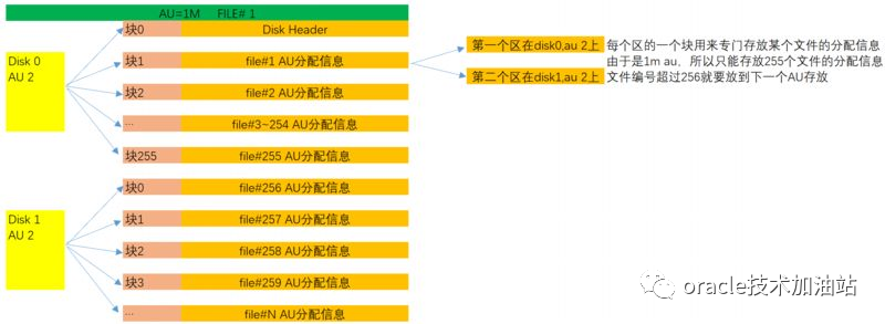 file 1起点通常位于0号磁盘的2号au,但是不一定,在19c中起点可能为au 10,最好的办法是通过文件头进行定位,然后找到他的分布情况,这是最准确的。