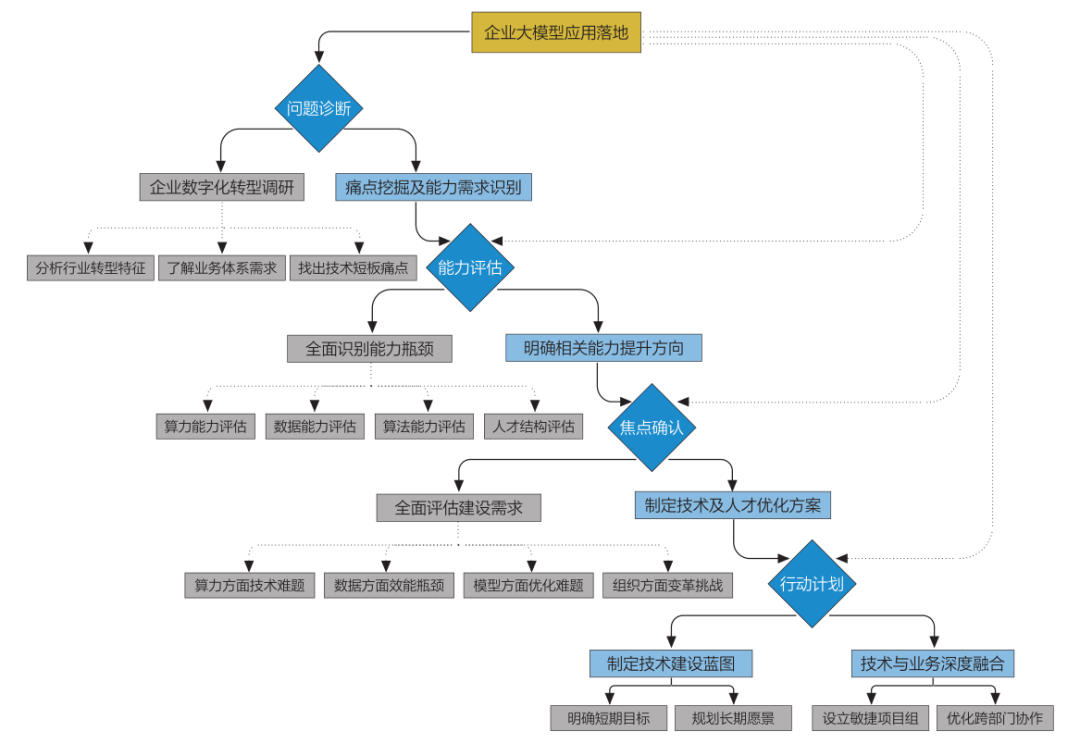 面对大模型技术应用的机遇与挑战,如何找准突破口,加速模型理念走向落地?我们提出“四维认知”的分析框架(如图1所示),从问题诊断、能力评估、焦点确认、行动计划四个维度,循序渐进地推进大模型应用项目的实施。