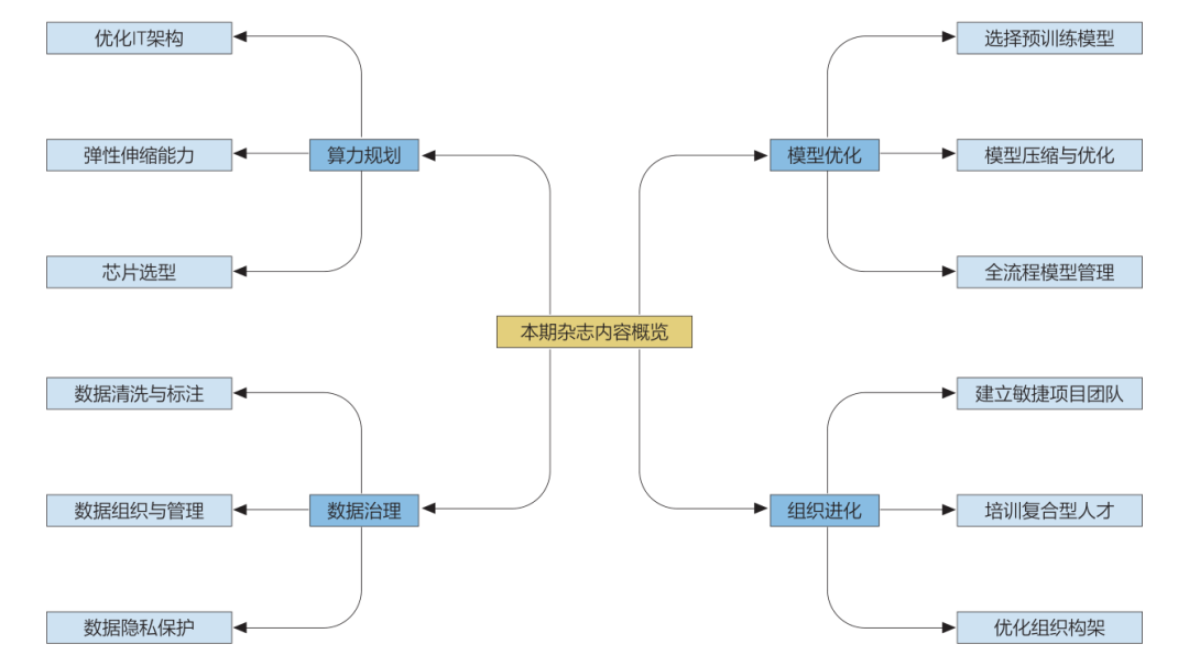 当然,行动计划并不止步于蓝图绘制,更要确保相关战略的有效落地执行。在企业推进大模型落地的关键节点,建议成立敏捷项目组,集中优势兵力,开展快速迭代。同时,建立科学的评估机制,通过技术指标、业务指标等多维度评估项目成效,及时优化迭代方向。此外,营造创新氛围,宽容失败,鼓励先行先试,让团队在攻坚克难中砥砺成长。最后,还要加强宣导,让大模型技术深入人心,调动全员参与的积极性,让组织的每个细胞都能感受到大模型技术带来的创新活力,进而形成强大合力。