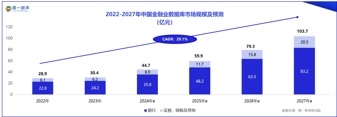 根据第一新声研究,2022-2027年中国金融业数据库整体市场将维持较高增长态势 ,2024年整体市场规模预计为44.7亿元,到2027年预计将超百亿元。金融数据库市场中,银行业占比最高,占金融整体数据库市场规模比例为80%左右,预计2024年中国银行业数据库市场规模达到35.8亿元。