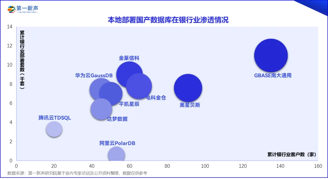 国产数据库厂商经过持续深耕,在银行业渗透不断提升,当前在银行业市场中已经处于主导地位。截至2023年末,根据第一新声不完全统计结果,9家典型国产数据库厂商在银行业本地部署数据库累计装机部署接近6万套。9家典型厂商中,已有6家厂商的累计银行业客户数超过50家。