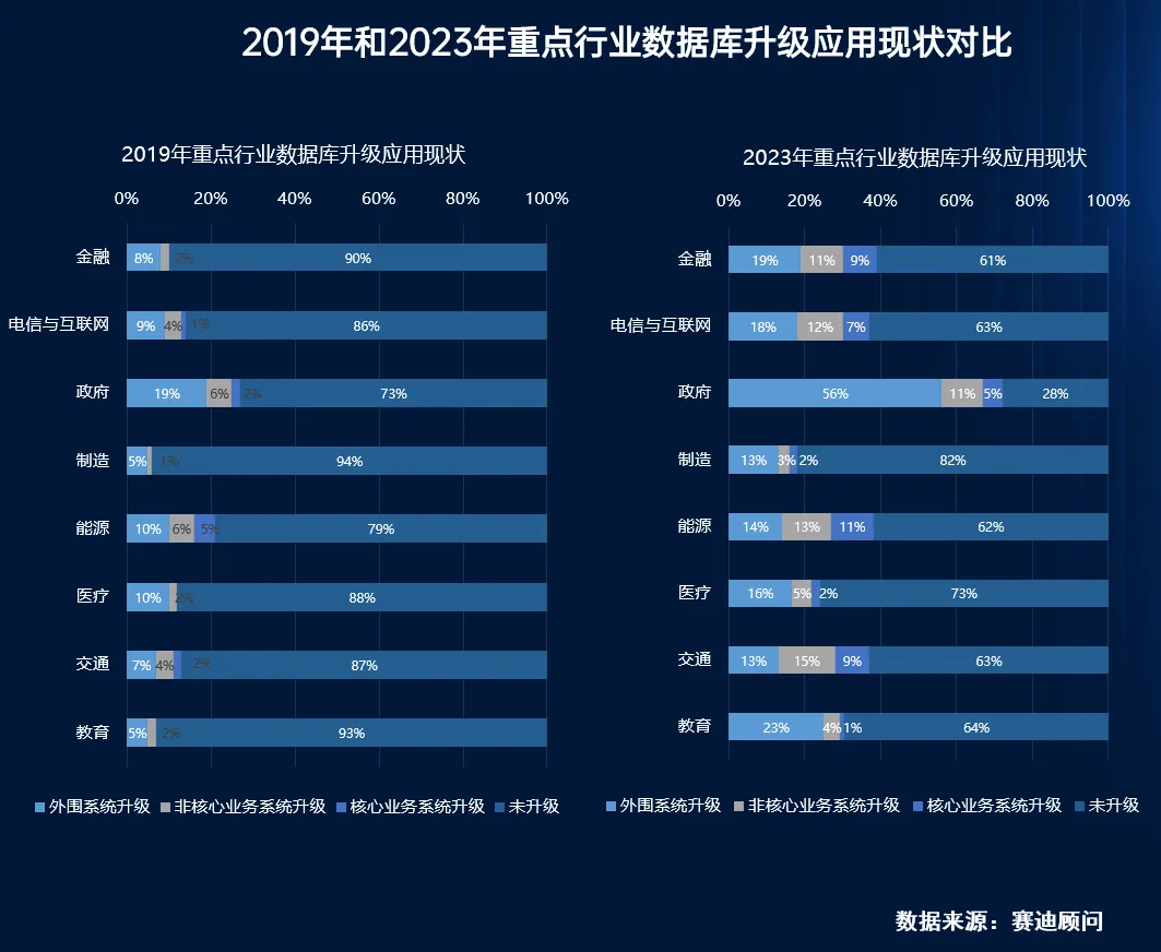 从行业分布来看,金融仍然是中国数据库最大的行业市场,销售额占比达到22.3%,其次是政府、运营商等。从行业应用来看,相比于2019年,2023年重点行业的数据库升级完成了30%-60%,主要以外围系统和非核心业务系统为主。截至2024年,目前党政领域的数据库国产替代率高达80%,已经基本处于替换的尾声阶段;八大行业由于对国产数据库的稳定性、迁移难度、运维难度等方面要求更高,所以整体替换率不高,金融行业非核心系统处于40%左右,能源行业不足15%,医疗、制造等多个行业甚至不足5%。