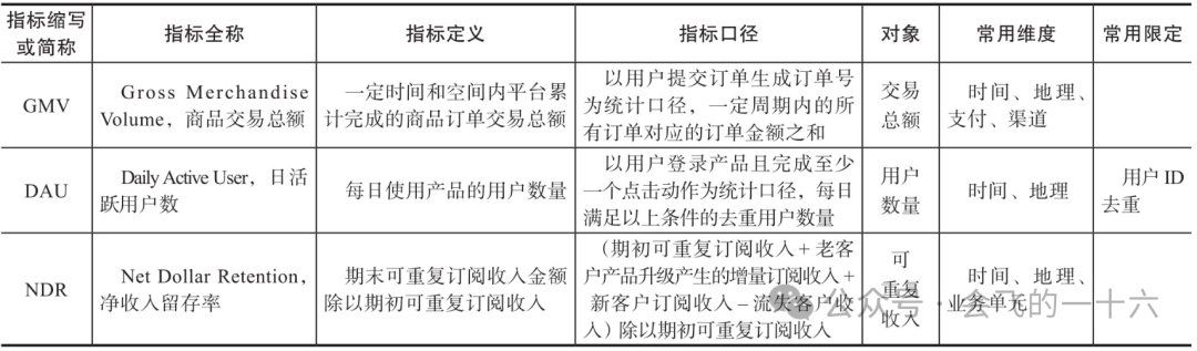 与财务指标十分接近的业务指标示例指标在应用于不同的业务领域时,会形成不同业务域的指标。通常可以从企业价值链的视角去梳理不同业务环节涉及的指标体系。例如,前文提到的DAU指标其实是属于用户域的一个典型指标,此外用户域的常见指标还有MAU、注册用户数、付费会员数量等,如表所示。