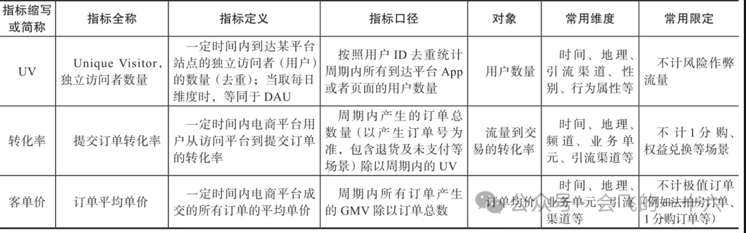 企业日常经营中使用的指标一般由对象、维度、限定、值4个元素组成。对象是指标衡量的主体。例如,GMV这一指标衡量的对象是商品交易总额。维度是指标可供分析的细分类型。例如,GMV这一指标可供分析的维度包括时间维度(分钟、小时、日、周、月、季、年)、地理维度(LBS商圈、城市、省份、国家)、渠道维度(自营、第三方;B2C、B2B)、类型(促销、平价;实物商品、虚拟商品)等。限定是为了清晰描述指标口径、避免理解上的二义性而添加的修饰词,是表示明确包含或者排除指向的限定用语。例如,一些行业研报为了统一GMV口径,会特别加上“不含下单未支付订单金额”这一限定。因为虽然GMV这个指标的定义在业内有一些基础共识,但是实际上阿里巴巴、京东、拼多多、抖音等不同的公司,对于GMV在口径层面还是有一些细微的差别,而且在不同场景提到GMV的时候也可能用的是不同的口径,例如是否包含下单未支付订单金额,是否包含退货金额,等等。在使用一个指标时加上一些具体的限定,可以有效避免大家在看到这一指标的时候产生定义上的误解。值是指标的具体数字,是衡量的一个结果。例如,据天猫官方发布的数据,2021年天猫双十一的GMV是5403亿元,而2020年是4982亿元,这里的两个数字就是指标的具体值。通常情况下,对象、维度和值是一个指标必不可少的三元素,而限定是一个指标在定义和表述时的可选元素。接下来用GMV这个具体指标来解构四元素。近十年是中国电商市场蓬勃发展的阶段,双十一、618等各种大促不断,GMV屡创新高。然而随着流量红利的见顶,阿里巴巴、京东等电商平台不再像以往一样每次大促后发布GMV数据。我们以市场上最后一个官方发布的大促GMV数据为例,2022年6月19日凌晨,京东官方对外发布当年618大促的GMV数据——379 332 394 617元。对这个指标我们用四元素来做一下拆解:● 维度:时间维度是指2022年6月1日至6月18日这18天。地理维度是指中国。渠道维度包括京东主站App和PC端、小程序、微信京东购物入口、京东全国全渠道门店,以及其他与京东合作的主要导流渠道。商品维度是指京东所有的实物和虚拟商品。● 限定:官方发布的数据并没有明确给出具体的限定情形,根据行业惯例,由于是即时统计,6月19日凌晨京东就发布了这一数据,显然这一数据是按照用户提交订单口径计算的,即按照生成订单号来计算GMV,并未扣除用户提交订单未支付、支付失败、用户7日无理由退货、异常订单等情形。3.常见的指标