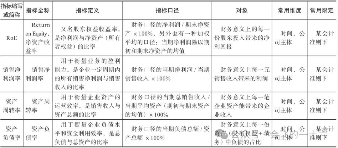 企业为了达成北极星指标,会先达成更多的支撑性指标。因此,一个北极星指标的背后往往有多个支撑性指标。例如GMV这个北极星指标背后,就有UV(独立访问者数量)流量指标、转化率指标、客单价指标作为支撑性指标。随着电商运营的精细化,有的平台会将GMV与活跃购买用户规模、平台活跃用户购物频次、购物品类深度、购物客单价等支撑性指标关联。企业指标按照其口径类型可以分为财务指标和业务指标,当然,部分指标在业财融合的场景下,既是财务指标又是业务指标。例如,上文介绍的净利润指标是一个财务指标,尤其是在其扣除了相应的税费等法定成本项之后。熟悉财务会计的读者如果打开一张财务报表,会看到上面有成体系的大量财务指标,这些指标从财务视角反映了业务经营的成果。后文会介绍财务领域非常经典的杜邦分析法,此处以杜邦分析法中的4个关键指标举例说明,如下表所示。