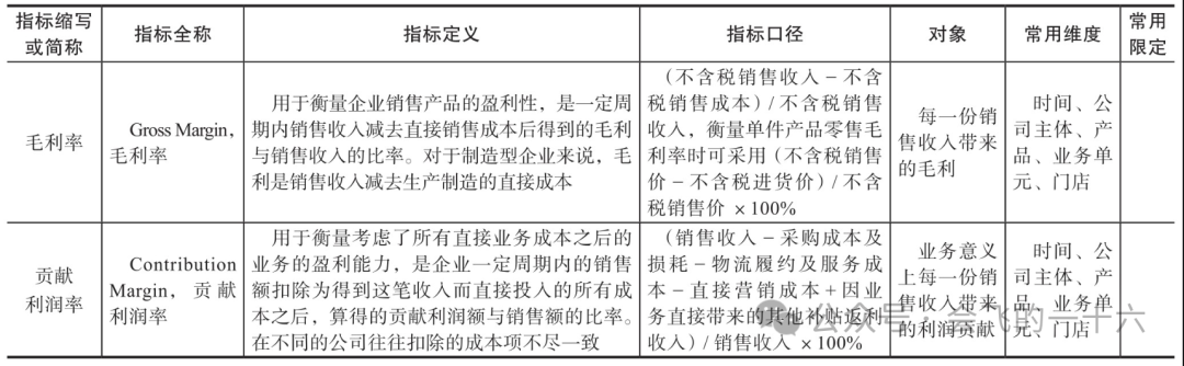 与财务指标关心经营的最终财务结果不同,通常来说,业务指标更加侧重于对当前业务逻辑过程和结果的度量,而且不考虑业务无法主动影响的税务、法务等政策带来的财务成本。另外,在企业实际应用的过程中,业务指标一般有集团总体视角和各个具体业务单元的应用视角。尤其是后者,具体的业务单元在测算自身的业务指标时,一般不考虑财务层面的分摊和去重等逻辑。为了方便大家理解财务指标和业务指标在逻辑和应用视角上的差异,我们举个例子。例如,同样是看盈利能力,业务单元经常会用贡献利润率来衡量自己的业务单元的盈利情况和指导业务团队经营,而不是看最终集团公司测算出的净利润财务指标。如果用零售商的视角来分析毛利率(业务指标和财务指标双重属性)、贡献利润率(财务指标)、净利率(财务指标)这3个指标,读者会更容易理解。例如,某零售公司的百货部门当年度销售收入为100亿元,商品采购直接成本为80亿元,那么其毛利率=(100-80)/100=20%。这部分百货销售涉及的物流履约成本为5亿元,商品损耗、丢失及残次处理等的成本为2亿元,营销、促销投放和客户服务涉及的总成本为10亿元,其中品牌方和第三方平台补贴为5亿元。此外,年末和供应商、品牌商协商收到销售返利10亿元。财务部年底核算百货部门的其他人力和管理成本为3亿元,另外分摊的公司整体后台管理成本(含产研分摊)为3亿元。那么百货部门当年度的贡献利润率=(100-80-5-2-10+5+10)/100=18%,百货部门当年度的息税前净利率=(100-80-5-2-10+5+10-3-3)/100=12%。不难看出,毛利率和贡献利润率这两个指标的逻辑和口径是十分不一样的(见下表)。毛利率只考虑了销售收入和采购成本之间的差额与销售收入的比率,而贡献利润率进一步考虑了这个业务单元营销、采购、销售、履约等完整业务逻辑闭环后,每一份销售收入能为母公司带来的利润贡献。当然,贡献利润率是一个典型的业务指标,在不同公司其口径定义因为扣除的成本项不同,往往会有所不同。而此处净利率指标的结果12%,进一步考虑了企业的各种后台成本分摊,但是尚未考虑公司层面的财务费用、税收成本等。通常,业务单元会主动监控与管理毛利率和贡献利润率这两个指标,并将其拆解到更细的业务单元责任人;而息税前净利率指标更偏向财务结果视角,往往会由财务团队来监控与管理,业务单元尤其是一线业务人员的注意力不会放在这个指标上。