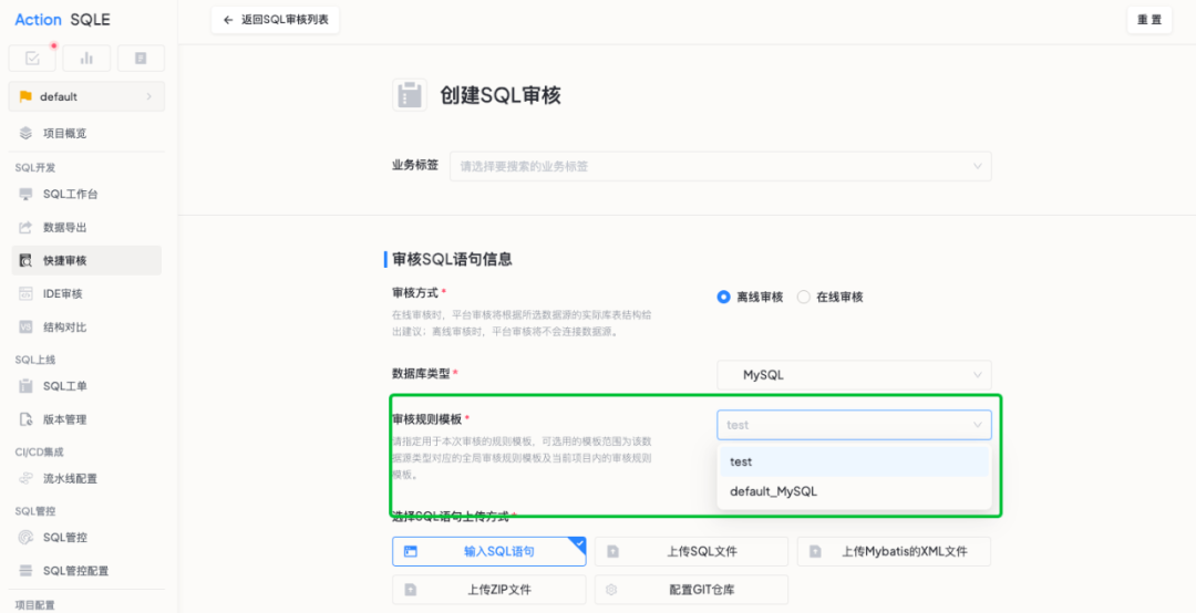 在使用快捷审核功能时,使用者现在可以根据不同业务场景,一键切换审核规则模板,轻松应对各类 SQL 审核需求,告别统一标准的约束,让 SQL 质量提升更精准、更高效。