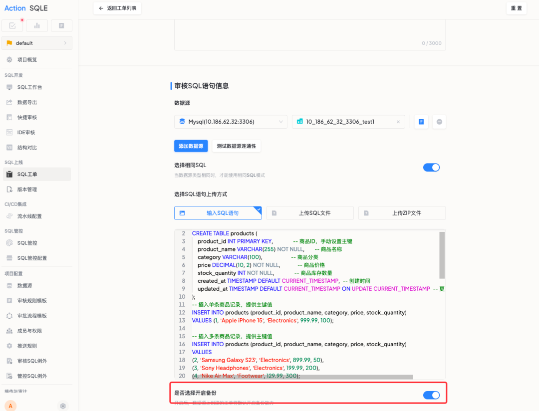 当使用者创建工单开启备份后,系统会基于 SQL 特性自动推荐最优的备份方案。