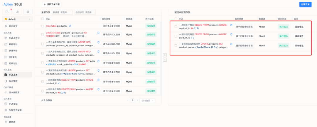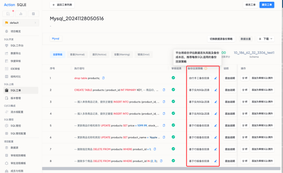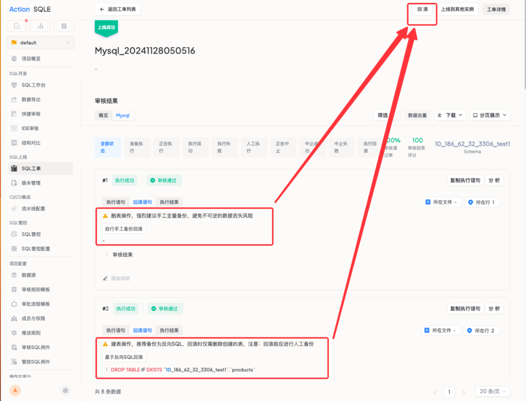 当 SQL 变更出现意外或需要紧急撤回时,使用者无需再手动编写回滚语句,只需轻点回滚按钮就能创建恢复工单。